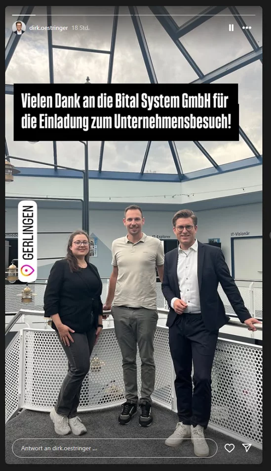 Am 4. August durften wir Dirk Östringer, Bürgermeister der Stadt Gerlingen, bei uns in der Bital System GmbH begrüßen. Ein spannender Austausch über digitale Transformation, IT-Infrastruktur und die Rolle von innovativen IT-Lösungen für die Region stand im Mittelpunkt.
